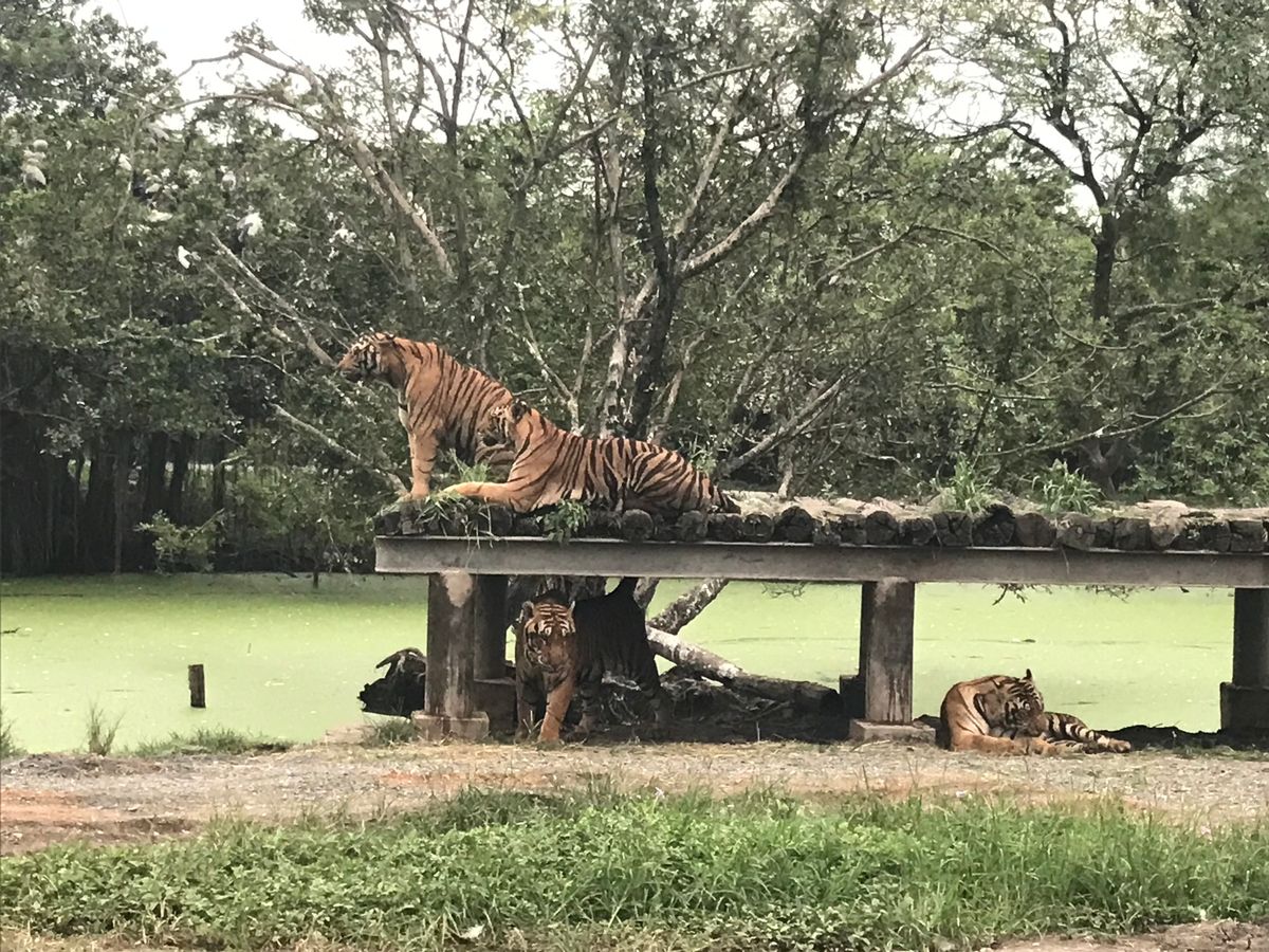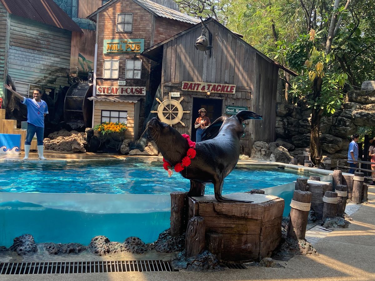 この動物園はガイドさんなしでは、上手にまわれません。いろいろなショーがありますが、始まる15分前につれていってくれて、前の席に座れるようにしてくれます。5分前にくると一番後の席になります。ショーの合間に動物との写真撮影を希望すると時間の無駄なく撮影場所につれていってくれます。ただ。子どもの虎との写真撮影場所はものすごく混んでいて、最後のアシカのショーをみたあとに、撮影場所にいった時はタイムアップで撮れませんでした。次の撮影時間は15時半からということでしたが、暑くてかえりたかったのでとらないで帰るこ晴れていますが晴れていますが雨期なので湿気が多いので汗が噴き出ます。私たちともう一組いましたが、もう一組は、小さなお子さんがホテルに帰りたがっていたので途中離脱で自腹でタクシーで帰りました。私たちだけの場合、他のお客さんがいないので好きな時間に希望して帰ることができるということになりました。雨期でしたが、天気に恵まれよかったです。8月前半は午前中は、晴れ。雨は午後から降っていました。この日は15時半くらいからスコールがありましたが長い時間は降りません。