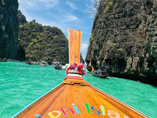 ピレラグーンはピピ・レイ島の中でも、群を抜いた透明度を誇る人気の絶景スポット。切り立った石灰岩の崖に囲まれたエメラルドグリーンに輝くラグーンです。