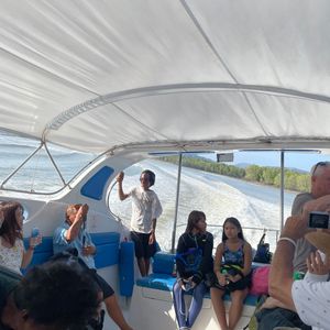 スピードボートで酔うのを心配される方は、ガイドさんのアドバイスの通り、船内で手すりにつかまるかたちで座席に立つことをおすすめします。私と子供1人は立っていたため全く酔いませんでしたが、父親ともう1人の子供は座っていたため船酔いしてしまったようです。(ツアーの方が島に到着する時などは『座ってください』と教えてくださいます。)