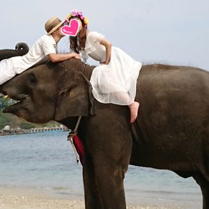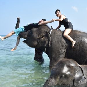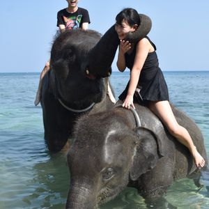 着ていた水着になり、いよいよ象との写真撮影。ただ象の前で写真を撮るだけと予想していたのですが、いざ始まると象が海で水浴びをしてから、背中にサッと乗せてくれました。しかも鼻に乗れと言われたり、いきなり海に落とされたり、ポーズを何度も変更しながらスタッフが一眼レフのカメラで何枚も写真を撮ってくれました。指示されるがままに象に乗って海に落とされて必死で写真を撮っていましたが、知らなかったからこそ楽しくて、この旅1番の思い出になりました。しっかりと訓練されていた象はポーズもばっちりで、日本と違って元気に動き回る象を見て、象がとても可愛く思えました。