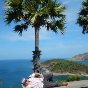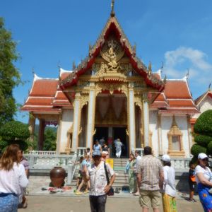 今回は初めてのプーケットなので島内観光をしてみようとこのツアーを申込みました。待ち合わせの時間に指定のロビーにはたどたどしい日本語を話す方が日本人?という言葉だと思いますが話しかけられた。まさかツアーであれば今まで人名を紙書いたメモを見ながらガイドが○○さんと呼んでいたし、余り良く聞こえなかったので無視してベンチに腰掛けたら、ベルボーイに何か話しかけて私に再び声をかけてきて、名前を呼ばれたのでそうだと実感してスタートしてバスへ向い歩き始めました。しかしその側にはバスはなく自家用車のみでまさかと思いましたがそのまさかで、私たち夫婦のみでのツアーがスタートしました。いくつかのビーチを車窓から眺めて移動したり寺院に入り写真を取ったり、かなりの数の写真をここからの写真が良いのだと立ち位置まで指示されて撮って頂きました。