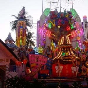 プーケットファンタシーショー見てきました。ショーを見るというより、アミューズメントパークみたいな感じで、屋台でダーツや輪投げなどのゲームがありお土産も屋台のゲームでゲットしました。ショーまでの待ち時間はゲームをしたり、ビュッフェを楽しみながら待ち、なによりも建物やお店などを見ているだけで楽しめました。ショーは私たちはゴールドシートに座ったのですが(ゴールドシートもスタンダードシートの値段はそんなに変わらないのでゴールドシートの方が迫力あります)目の前を象が通り過ぎ初っ端から大迫力。神秘的な演出やコメディーっぽいところや、とにかく盛り沢山です。プーケットに行ったら、絶対行った方がいいですよ。