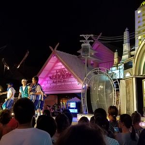 19:45から園内入り口近くのミニステージでショーがあります。ノリとクオリティは学園祭です。