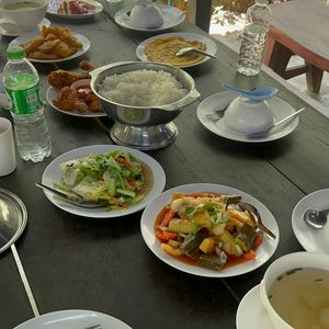 休憩所でランチ。品数はありませんが、定番のライスとチキン、スイカなど、美味しくいただきました。シャワーは水しか出ませんし、シャンプーなどもないので、ホテルに帰ってからでも問題ないでしょう。