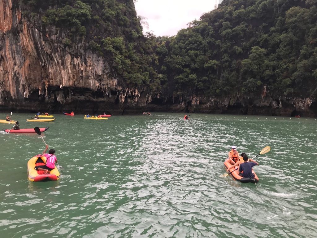 家族三人で参加さしました。大人三人時間通りのホテルお迎えでハーバーへ、以前ピピ島観光へ行った時利用した懐かしいハーバーでした。待合場所では、美味しいドリンクバーとおやつを頂き、数名の日本人と一緒でホッ!日本語での説明を聞き、トイレを済ませ出発!鍾乳洞洞窟探検〜シーカヌーでは漕ぎ手の方が色々スポットに上陸させてくれたり、写真も!すれ違うカヌー同士挨拶を交わし、ちょっとした国際交流。〜ジェームスボンド島では、斜めに切り立った岩、タイの聖地だそう。〜水上生活の島では、美味しいランチバイキング。〜綺麗な砂浜の島ではマリンアクティビティ!