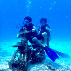 肝心のダイビングですが、私が初心者だったので1から丁寧に教えていただき、ご指導のおかげで1本目からツアーの中で1番深い所まで潜る事ができました!沈没船ならぬ、沈没バイクにも遭遇!チンアナゴやモンハナシャコなど、普段は絶対触れ合えない生き物と超接近(°▽°)