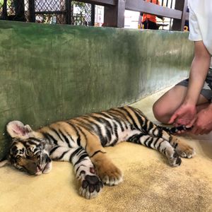 1時間待ちと言われてましたが、ガイドさんが現地スタッフに聞いてくれたおかげで、1時間も待たずにトラも触れ合えました。