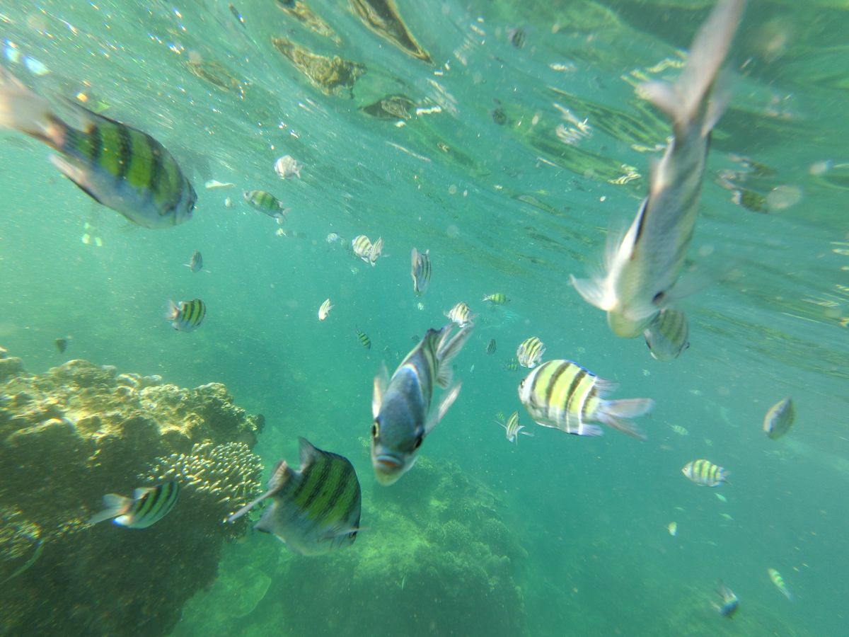 シューノーケルポイントでは、船からクッキーや一緒に海に入ったスタッフがバナナを少しずつ魚に与えると、沢山魚がよってきてすごく身近に感じます。