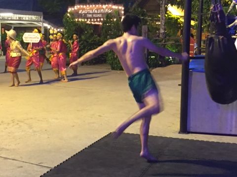 大きな遊園地で、子供達のゲームやお土産屋さんが並ぶ中をどんどん進むと、とっても大きな象の宮殿のような外壁。中に入れるとは思わず、凄い外壁だな〜と思いながら、ディナー会場へ。ワインのボトルを頼むと、空中バーへタイの民族衣装を纏った美女がロープで天井へ行き、ワインボトルを取ってきました。驚きでした。食事が終えて、外でにショーを見てから、本会場に。なんと先程に外壁の中へ入ることが出来ました。大きな会場で、象のショーやマジック、更には民族の生活などの演芸などなどてんこ盛り。ちょっと残念なことは、ショーの開始時間が9時なので、子供達は寝てしまいました。