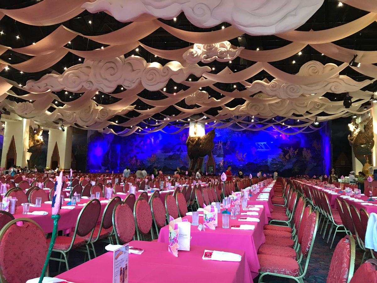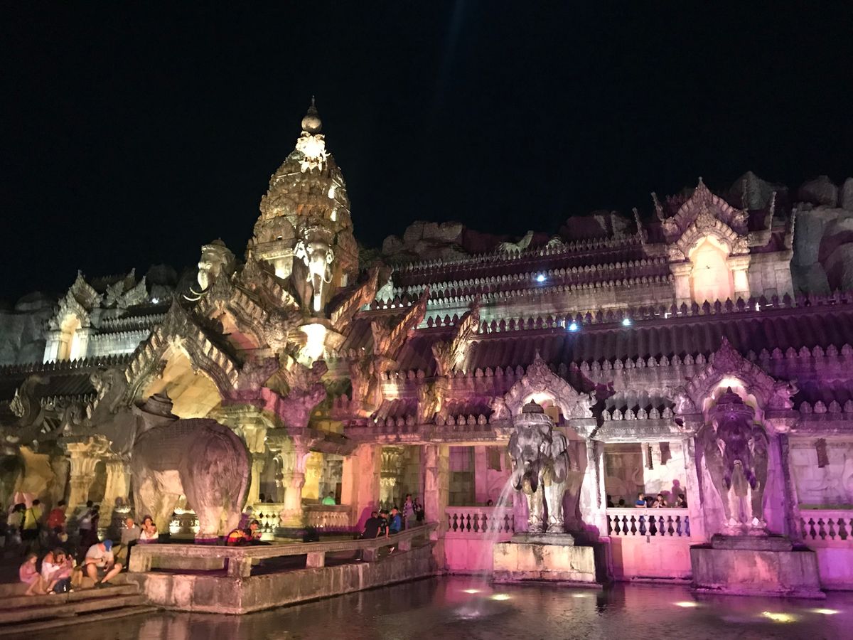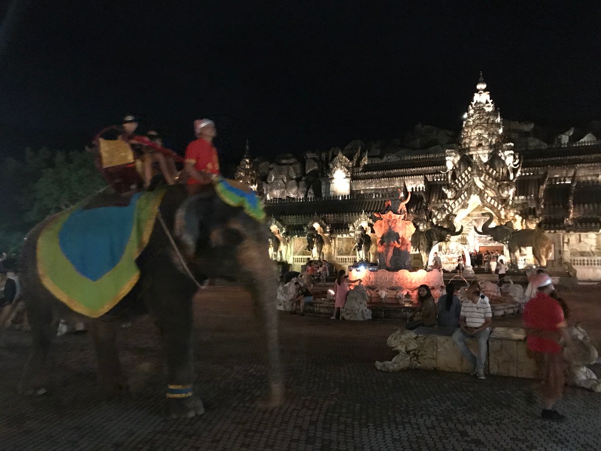 Fantasea のバスに乗ってエントランスに着くと周りはすでに真っ暗、建物全体がライトアップされて、これからショーが始まるんだぁ、とワクワクしました。中に入るとお店が沢山あり、ぶらぶらと散歩をしながらお目当ての象の絵のT-シャツも買うことが出来ました。その後ご飯を食べに行くと、巨大なボールルームでビュッフェスタイルの美味しい夕食をおなか一杯食べ、いざ会場へ。始まるといきなり象のお出まし、演出にびっくりしました。ストーリー性があり、象以外にも、馬、やぎ、鶏、なども出てきて面白かったです。テンポ良く次々と場面が変わり飽きることなく時間があっという間に過ぎてしまいました。どのシーンでも象たちは演技が上手で、象はとても頭が賢い動物だなぁと改めて思うと同時に、象と象使いの間に信頼関係がしっかりあるんだなぁと感動しました。ここでしか見れないお薦めのショーです!!!