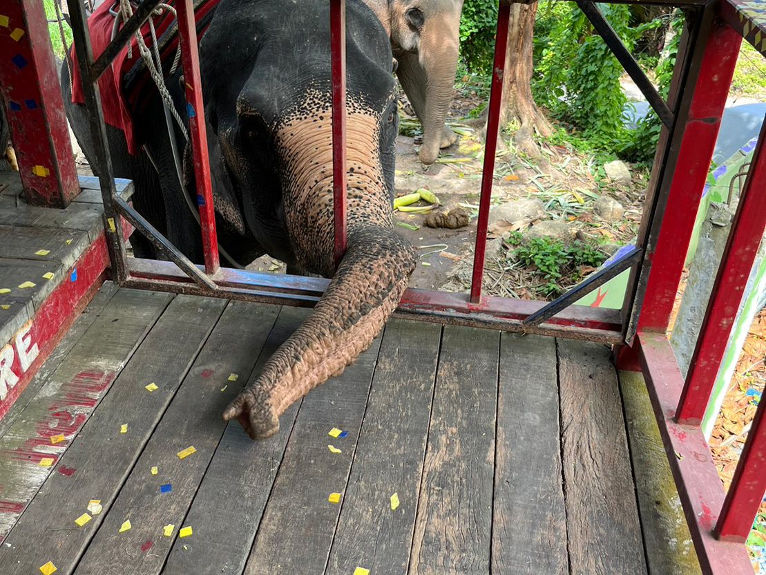 乗せてもらった象はとても穏やかでした。象使いが下からたくさん写真や動画を撮ってくれました。象にカメラを向けると、カメラの方を向いたり立ち止まったたりするなんともベテランな象でした!