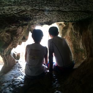 薄暗い洞窟の中では、象の鳴き真似の声を出してくれたり