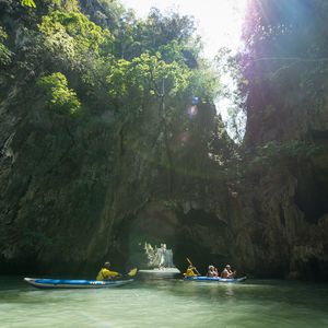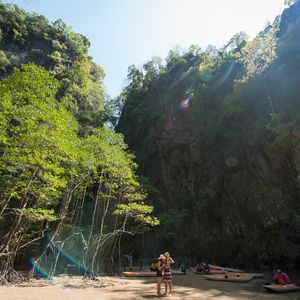 最初のホン島では神秘的な洞窟内や湾内を、シーカヌーに乗って巡りました。エメラルドグリーンと奇岩の織りなす景色がとてもキレイで感動しました。中には寝転ばないと通れないような洞窟もあり、アドベンチャー気分が味わえました。カヌーは現地の方が漕いでくれるので、自分達で漕ぐ必要はありません。ただ、リクエストしたらカヌーを漕がせてもらうこともできます。