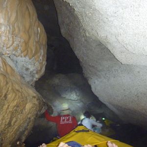 洞窟探検で鍾乳洞を歩いて散策しました。洞窟の中は暗いのでベッドライトを付けての移動です。とても滑りやすくごつごつしていたり水があるところ歩くので、歩きやすい靴がオススメです。