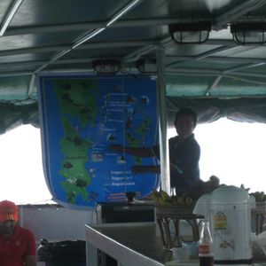 船酔いが心配でしたが50人乗りの大きさの船で酔いませんでした。日本語スタッフのおじさんはずっとパイナップル食べてました(笑)