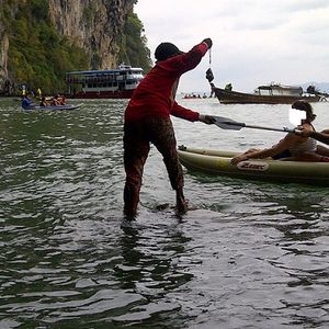 こんな狭いところを通るのっていう経験ができますよ。足などちょっとでも当たれば岩に貝がついてるので、ケガするようなところを通って最後に行き着いたマングローブの生えたところ、不思議な空間でした。真ん中が浅いので歩いたり、マングローブに登ったり、ダンナはカヌー漕がしてもらってました。私たちのカヌーを漕いでくれたのは、若い10代の子で一生懸命片言の英語で説明してくれました。チップ100バーツ渡したらすごく喜んで、最後の泳ぐところでもカヌー乗るかってきてくれました。日本語のガイドで行ったけど、船のスタッフは親切だし、案内はカヌーの少年だし、必要なかったです。日本語ガイドのピックさんもヒマそうでした。後から考えるのですが、私たちが寝転んで当たる~って騒いでたとき、あの少年はどんな体勢でカヌーを漕いでくれてたんでしょうか?すごいな~