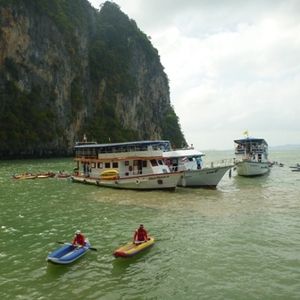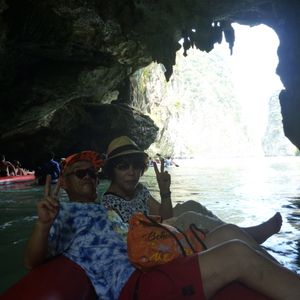 参加者はほとんどが外人、それもロシア・イスラエル・中国・インド・ドイツと世界各国からのご参加で、日本は少数派でした。最近の傾向ですかね~。なので、日本人ガイドが専属でつくのは大変ありがたく、また優先的に誘導してくださるので、助かりました。雨にも濡れず、待つことも少なく。専用車で送迎なので、多少の追加料金が発生してもVIPがおすすめです。ツアーの内容は、洞窟2か所をカヌーで回り、007の撮影された島を散策、あとは水泳かカヌー遊びと計4島をめぐる内容でした。食事はほとんどフライもので、ヤングコーンのフリッターとか、魚の丸揚げ、チャーハン等口に合うものでした。味はまあそれなりですけど。そうそう、カヌーに乗るときは100Bt位最初に渡すと、その後写真を撮ってくれたり、とっても親切にしてくれますので、お忘れなく。