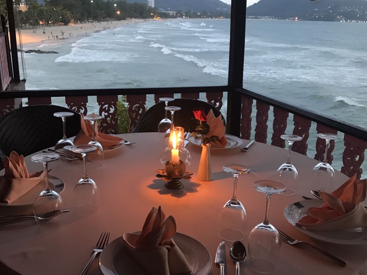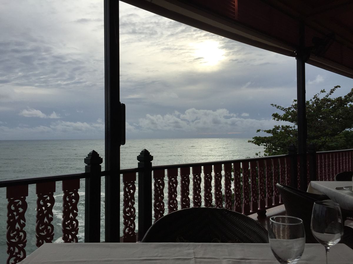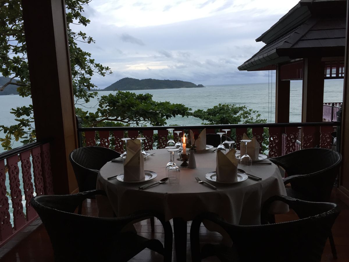 サンセット(夕陽)は時期的なところからか、海を見て右手の草木で夕陽そのものは見れませんでしたが、日が落ちてのプーケット市街の夜景がきれいでした。食事のほうは、わたしにはたいへん良かったでした。同行した妻からは、食事内容はタイ料理に中華風を取りいれような(たとえば”しょうが”を取り入れたりなど)洗練されたのと、食器、盛り付け綺麗でした。
