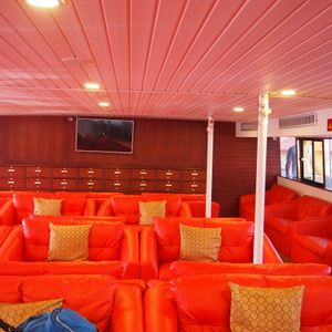 船の席のランクがあるようでこちらエコノミーより上のはシルバー席でした。行きはドリンクとカップケーキのサービス、帰りはドリンクとパイナップルのサービスがありました。かなり荒波の中だったので大型船でも大揺れ。船内はクーラーもガンガン。酔い止めと羽織る物があるといいです。港からホテルまでの帰りのドライバーは画用紙にホテル名の手書きを持って大勢のドライバーが。探すのに一苦労しました。