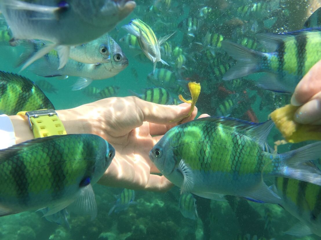 遠目のブイのところまで、怖いイメージでしたが、ライフジャケットを着ていけば、全然安全で、熱帯魚に囲まれること間違いないです。