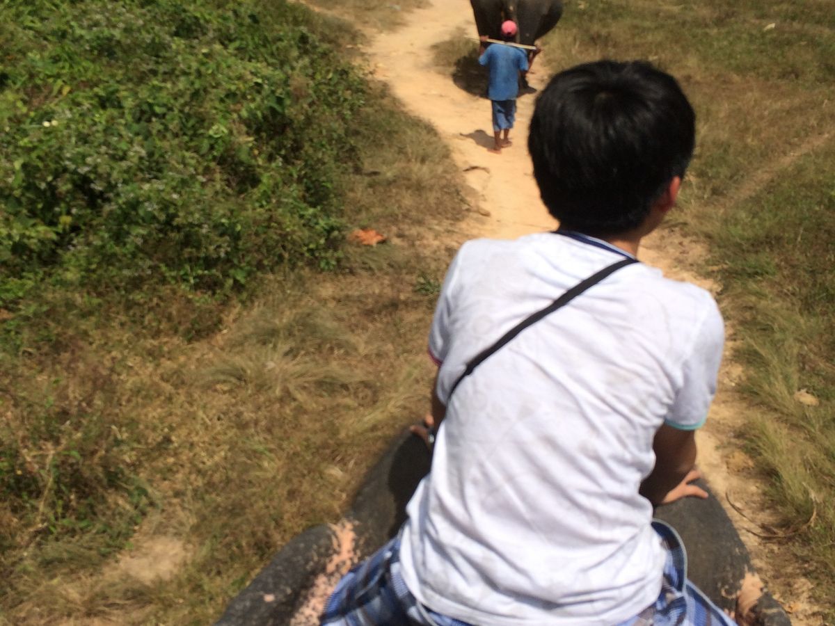 最初は、初体験に喜んでた子供達。でも、ただダラダラ散歩も、60分は飽きるなと思っていたら、突然、象使いの人がカモンと、子供達を象の頭の部分に座らせてくれました。そして、そのままお散歩に、、、。