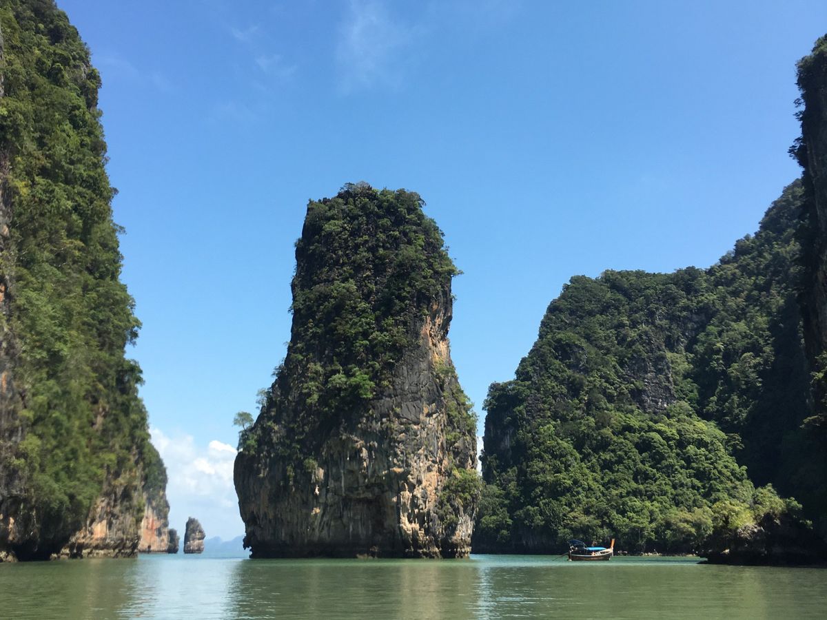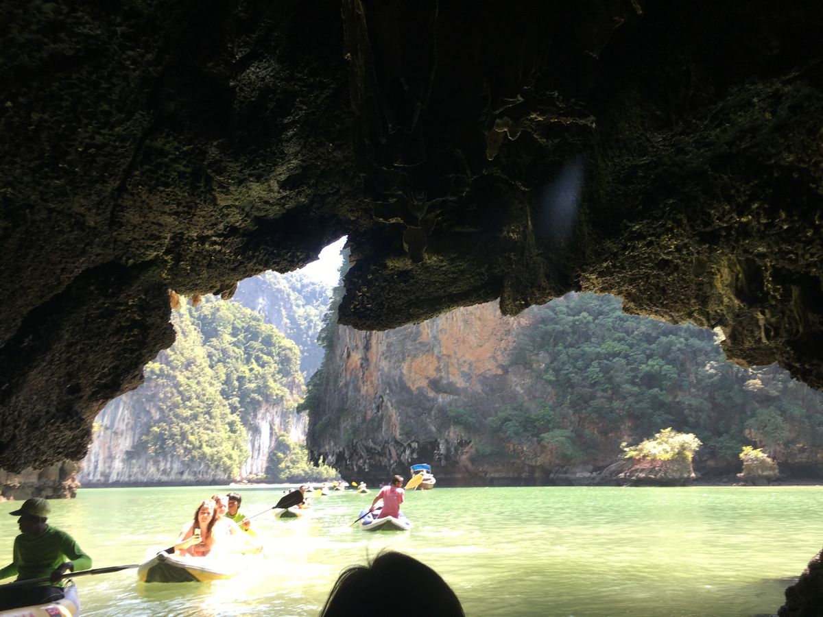 次のホン島ではシーカヌー体験。専任の方が漕いでくれるので、私たちは乗っているだけでOKです。すいすい進みながら奇岩や洞窟を巡ります。プーケットは白砂ビーチのイメージが強かったですが、こんなワイルドな島もあるんですね! 陽気なカヌー漕ぎのお兄さんが、「あの岩は魚、あの岩は鳥に見えるよ(?)」なんて解説してくれたり、まるでカメラマンのように私たちの写真をいっぱい撮ってくれました。