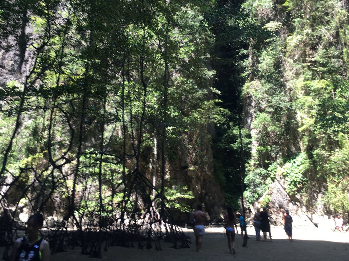 最初の島ではさっそく洞窟探検。ヘッドライトで照らしながら暗い洞窟をくぐり抜けて……ドキドキ感が楽しめます。たどり着いた場所は大自然の中、そこだけ空がぽっかり抜けたような不思議な空間。しばし別世界を楽しみました。干潟には小さなカニや魚がいて可愛かったです。