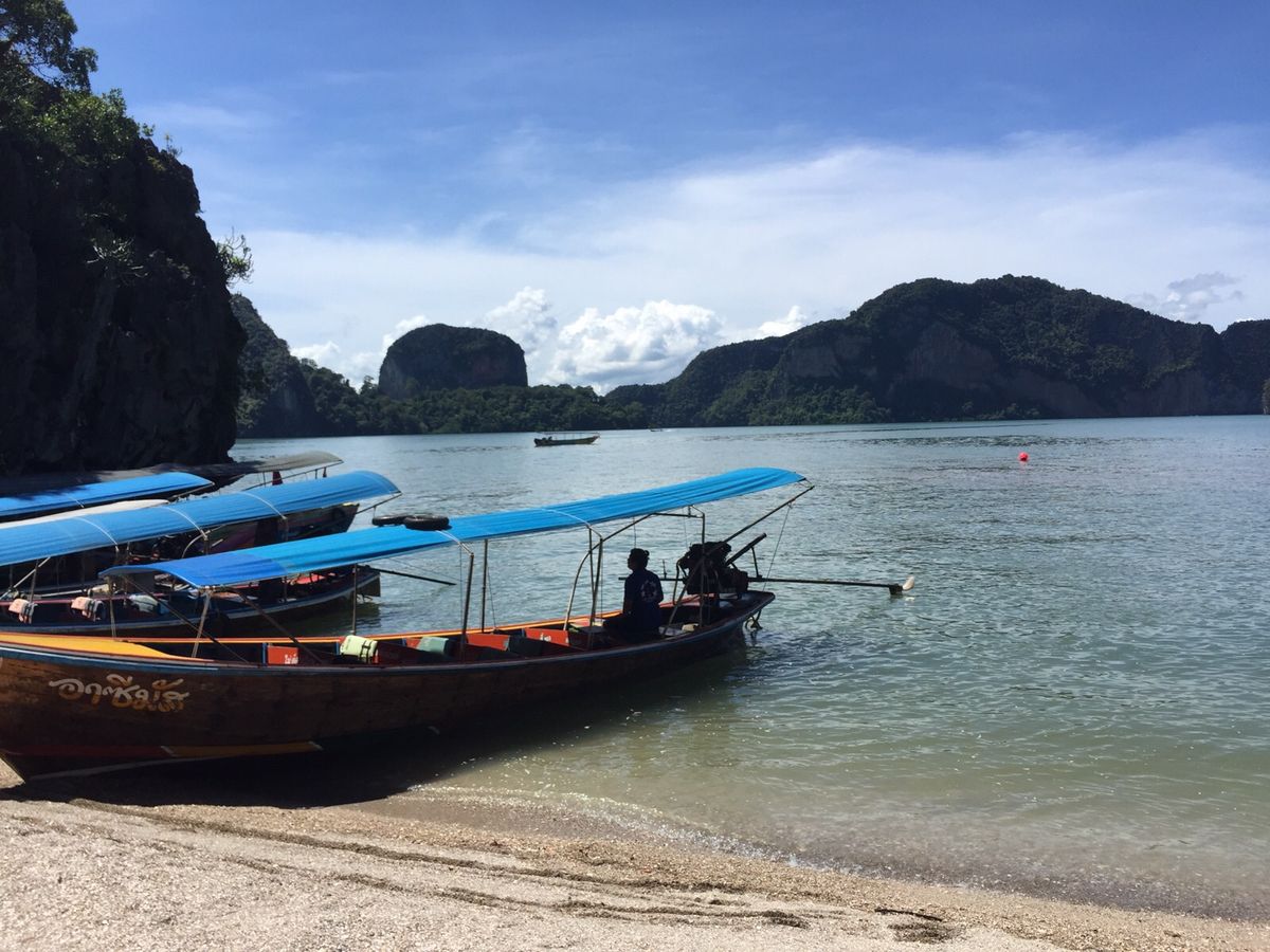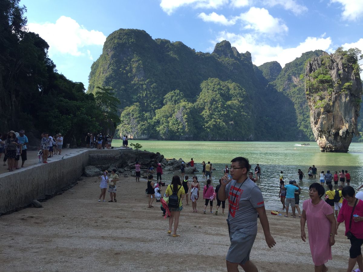 次は007の島へ。映画を見ていないのであまり感動は無かったけど、記念撮影スポットとして良かったです。そちらも沢山の人がいてビックリでした(笑)小さな島にお土産屋さんもビッシリ!一回りしてボートに戻り、次は砂浜でゆっくり出来る海水浴場へと向かいました。その間も飲み物などのサービスあり(≧∇≦)砂浜に着いて一時間ほどの、フリータイムがあり、砂浜でチェアーを借りて(有料)