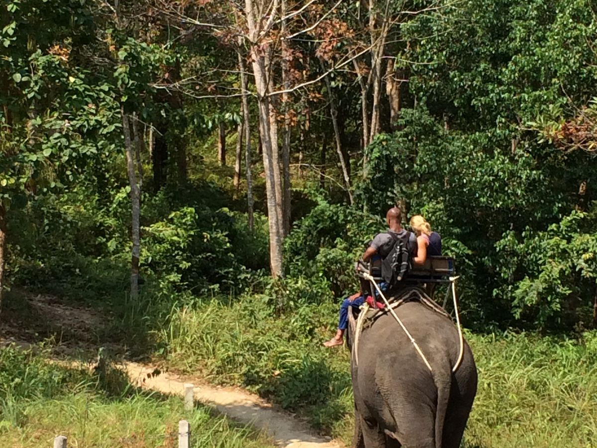 そこから約1時間かけて象のいるところへ案内されました。初めて象にのったので、象の