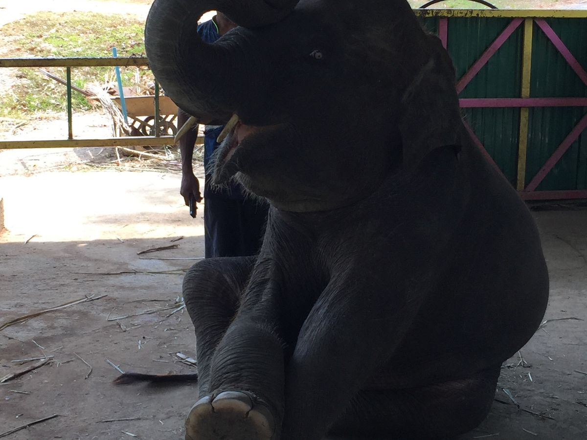 象乗りが終わると、小象のショーがあって、可愛らしいポーズを沢山してくれました。房の小さいバナナ(確か40Bくらい)を販売していて、直接の餌付けもできました。ショーの終わりには柵の中に入って小象と記念撮影(無料)もでき、大満足のツアーでした。