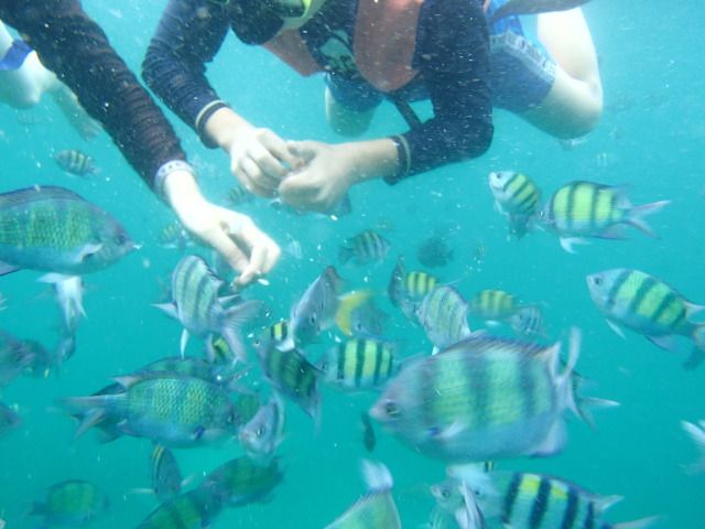 熱帯魚が見たくて、泳げないわたしはこのツアーに参加しました。5メートルぐらいの水深で餌付けされた魚たちが寄ってくる様は、圧巻でした。初めて潜った感想からすると、当初は水圧の関係で耳が痛くなり