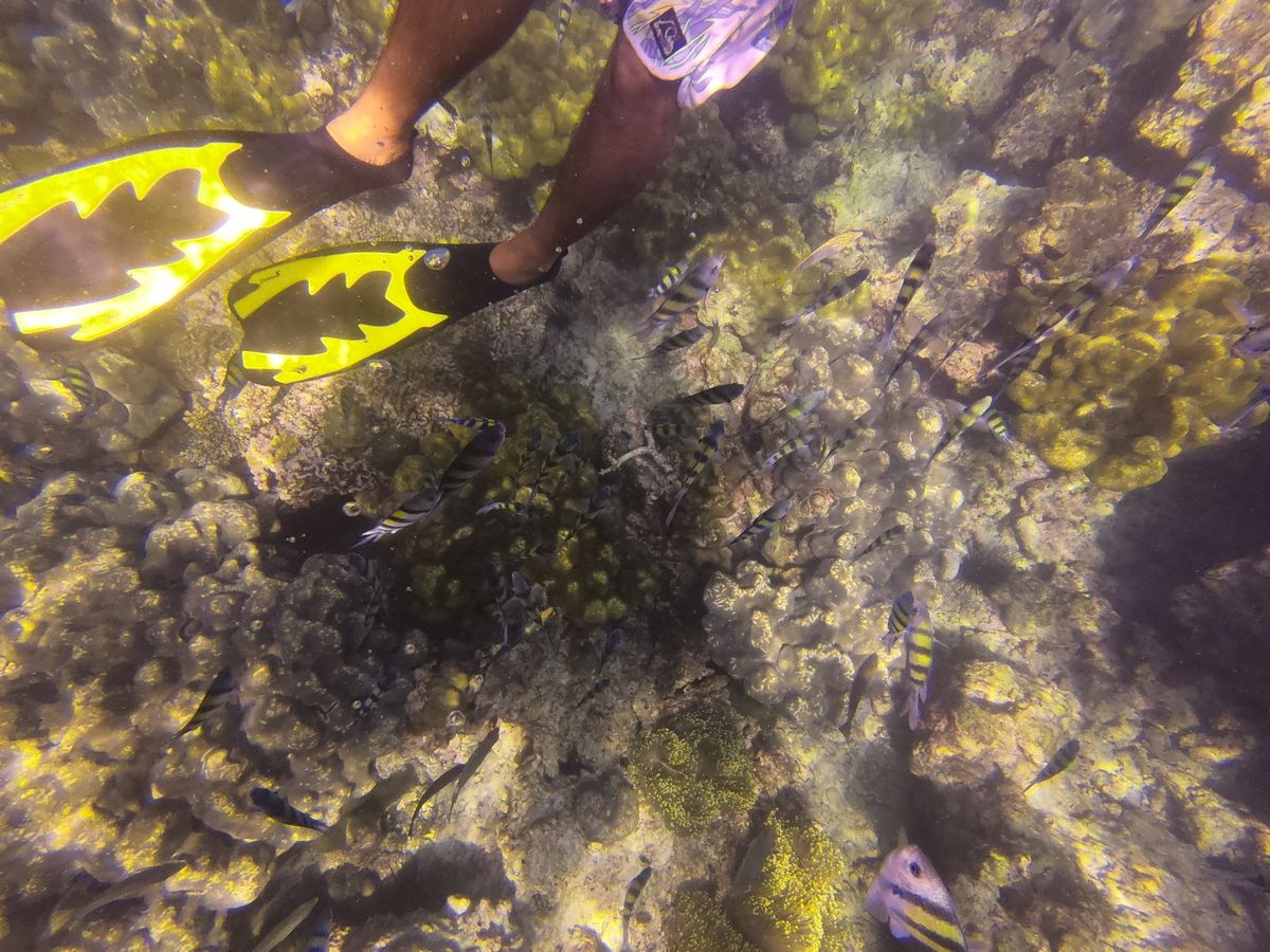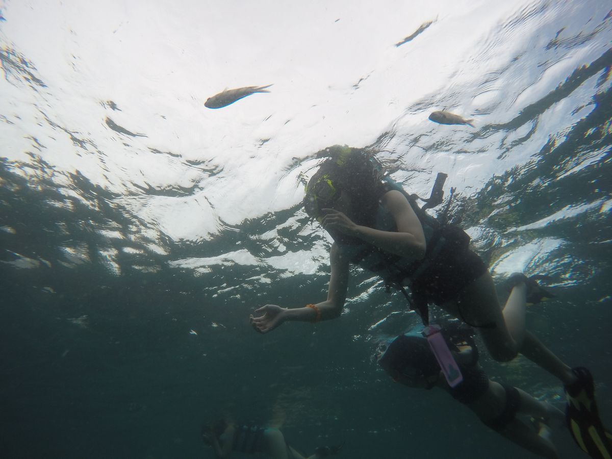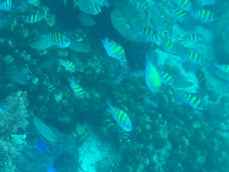 途中、ボートスタッフが魚のエサ?フルーツ?を渡してくれて、海中に入れると魚が一気に寄ってくるのがおもしろかったです!Goproを持っていたので素敵な写真がたくさん撮れました。