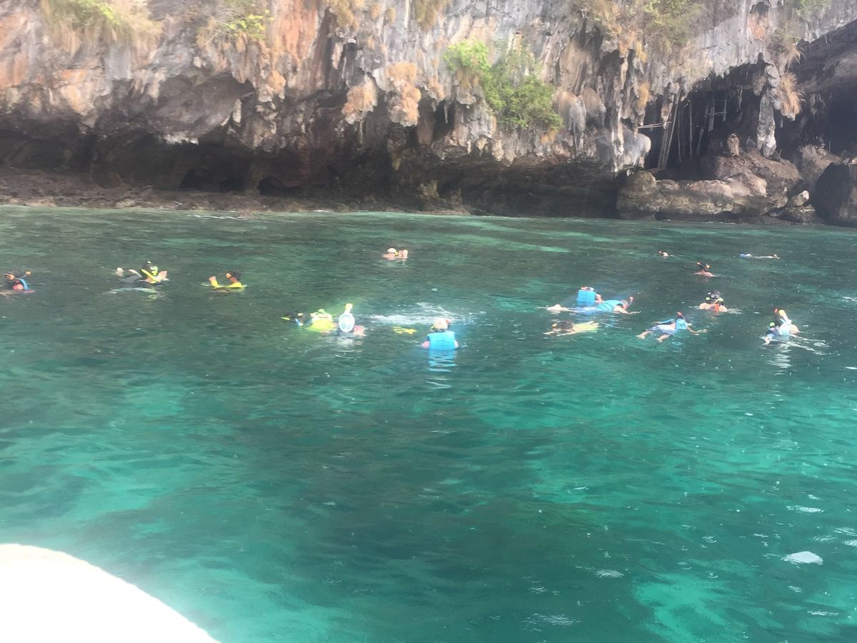 朝7時にホテルでピックアップの予定でしたが、少し遅れてバスが到着しました。それまでも他のツアーの観光客がロビーにわんさかいて、言葉も通じず置いていかれたらどうしようと心配でしたが、ドライバーの方が探してくれて無事にバスに乗ることができました。バスに乗ると私達で満席、国籍もインターナショナルでした。マリーナは小さい施設かと思いきや、立派できれいな施設でした。マリーナに到着すると、フィンの有料貸出やピピ島についての説明や興味深い話を聞き、出発時間までは軽食をとったり酔い止め薬を飲んだりして過ごしました。そしていざ出発!日本語ガイドさんはとても親切で面白い人でした。ボートは揺れが激しく、ある意味絶叫マシンに乗っているようでしたが、海も風も気持ちよかったです。また、飲み物や果物があって快適に過ごすことができました。なんと言ってもピピ島は本当に美しく、パンフレットで見たそのものでした。プーケットに旅行される方は絶対おすすめです!