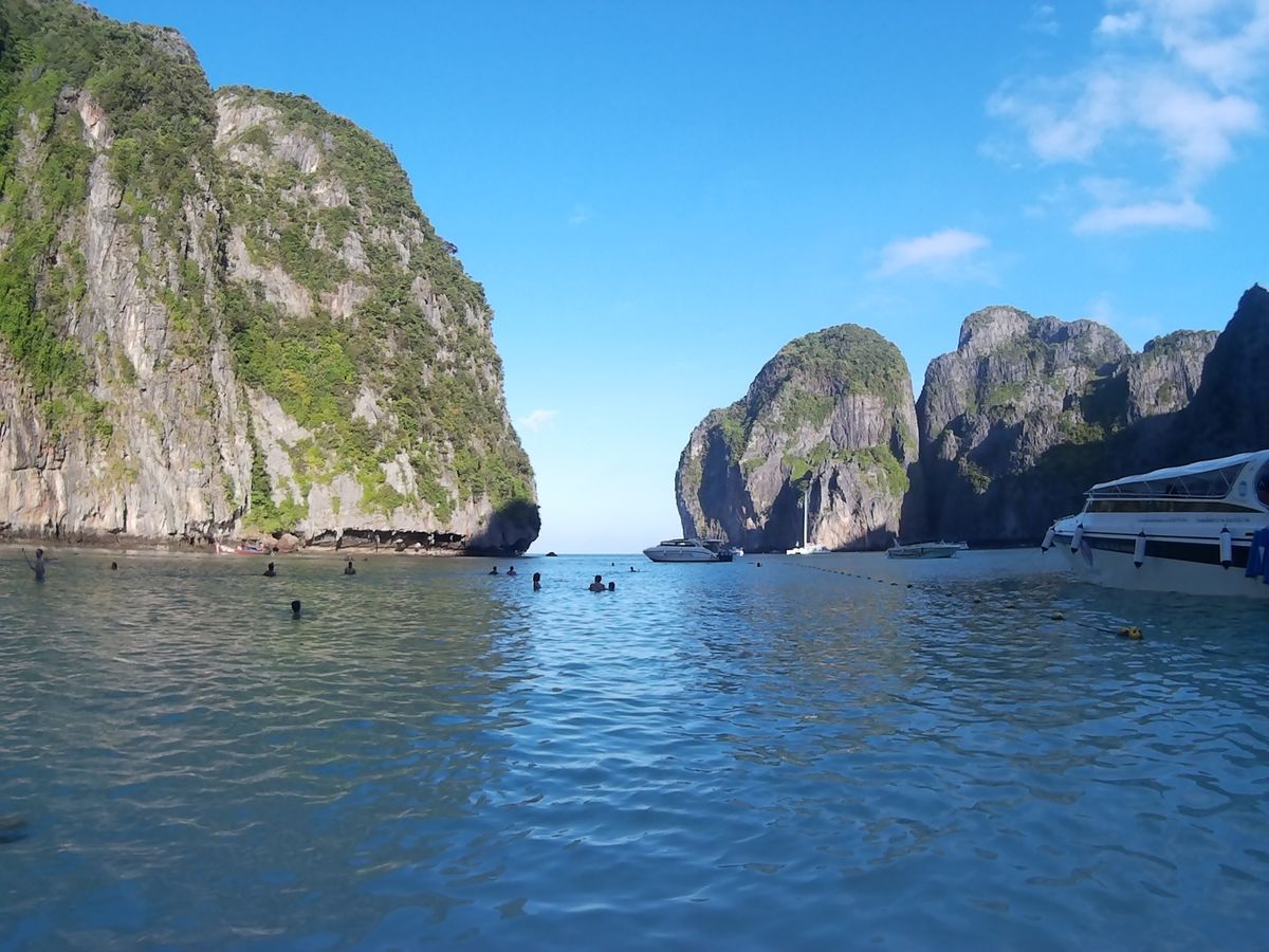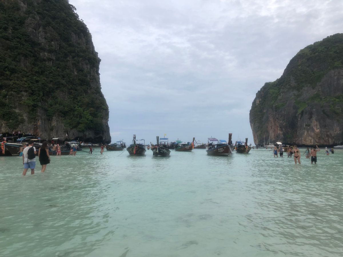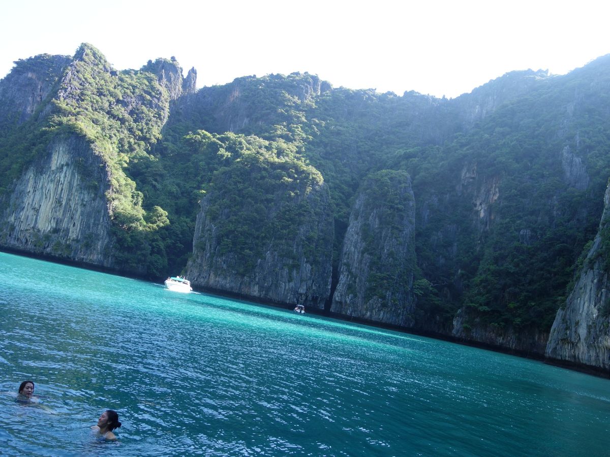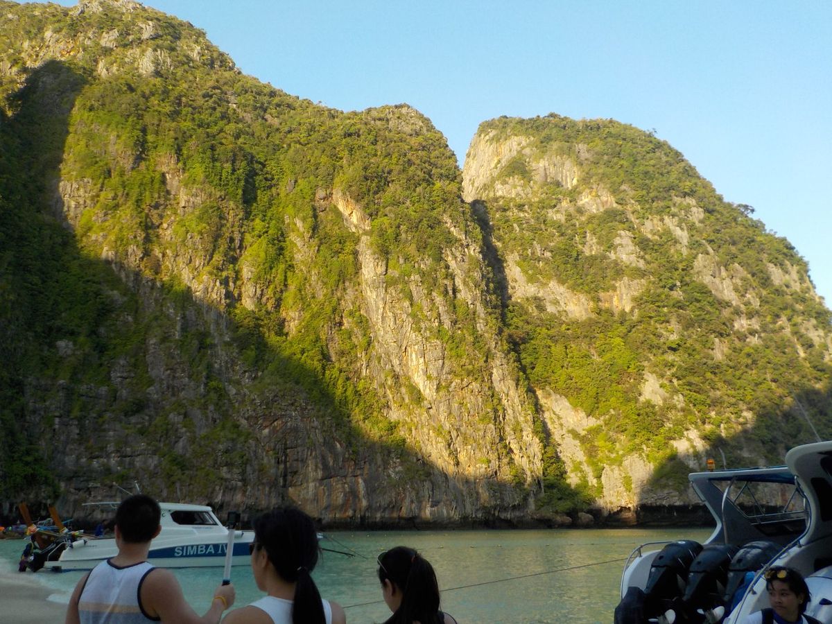 6時半に港を発ち、マヤベイまで約1時間。早朝に出発することで、静かなマヤベイを楽しめるというのが、このツアーの売りなのですが、既に、結構な数のボートが居て、ビーチは賑やか。11月初旬というシーズンの始まりで、この状況なら、これからもっと混むんでしょうね。