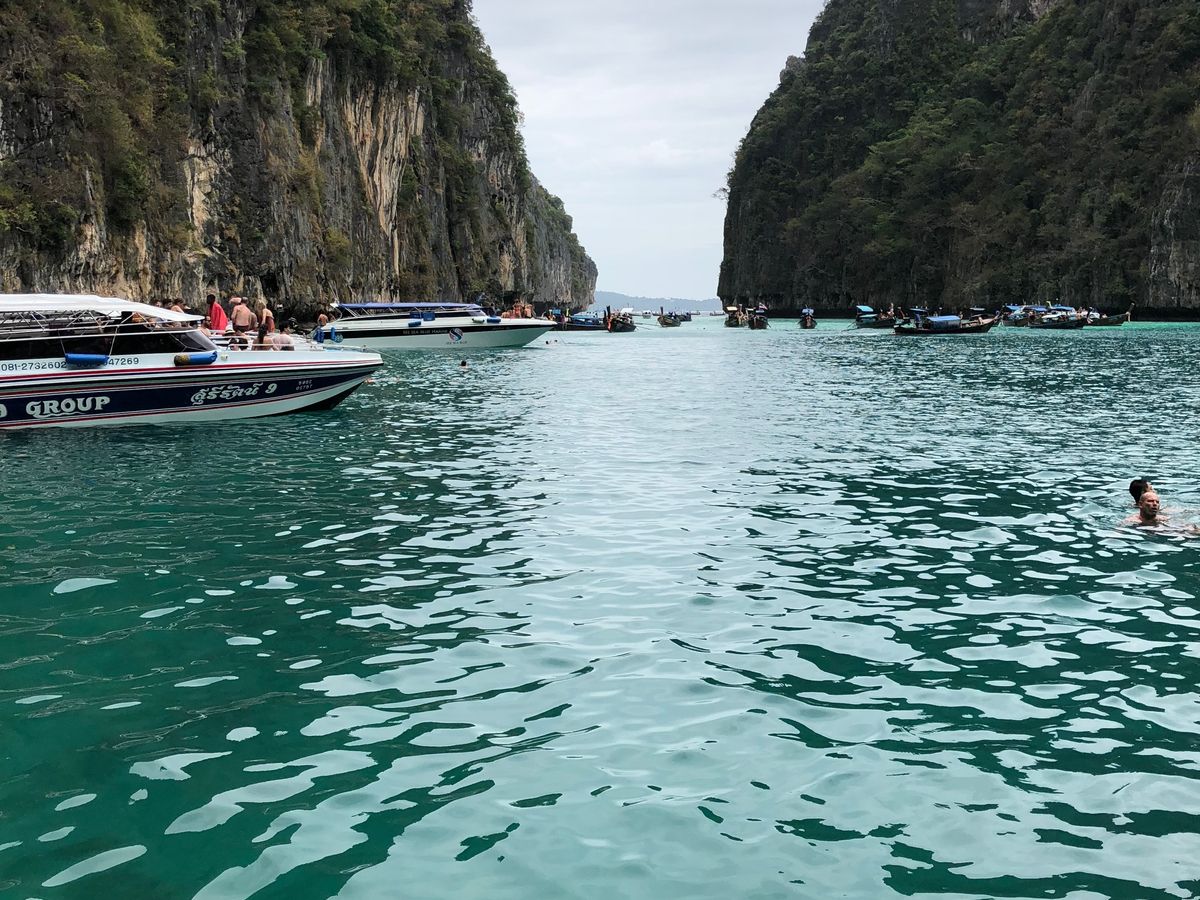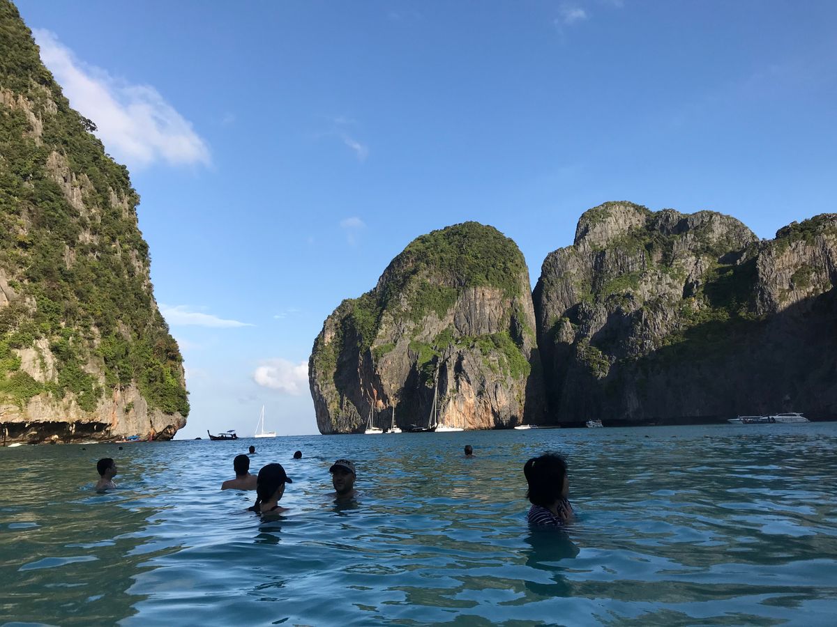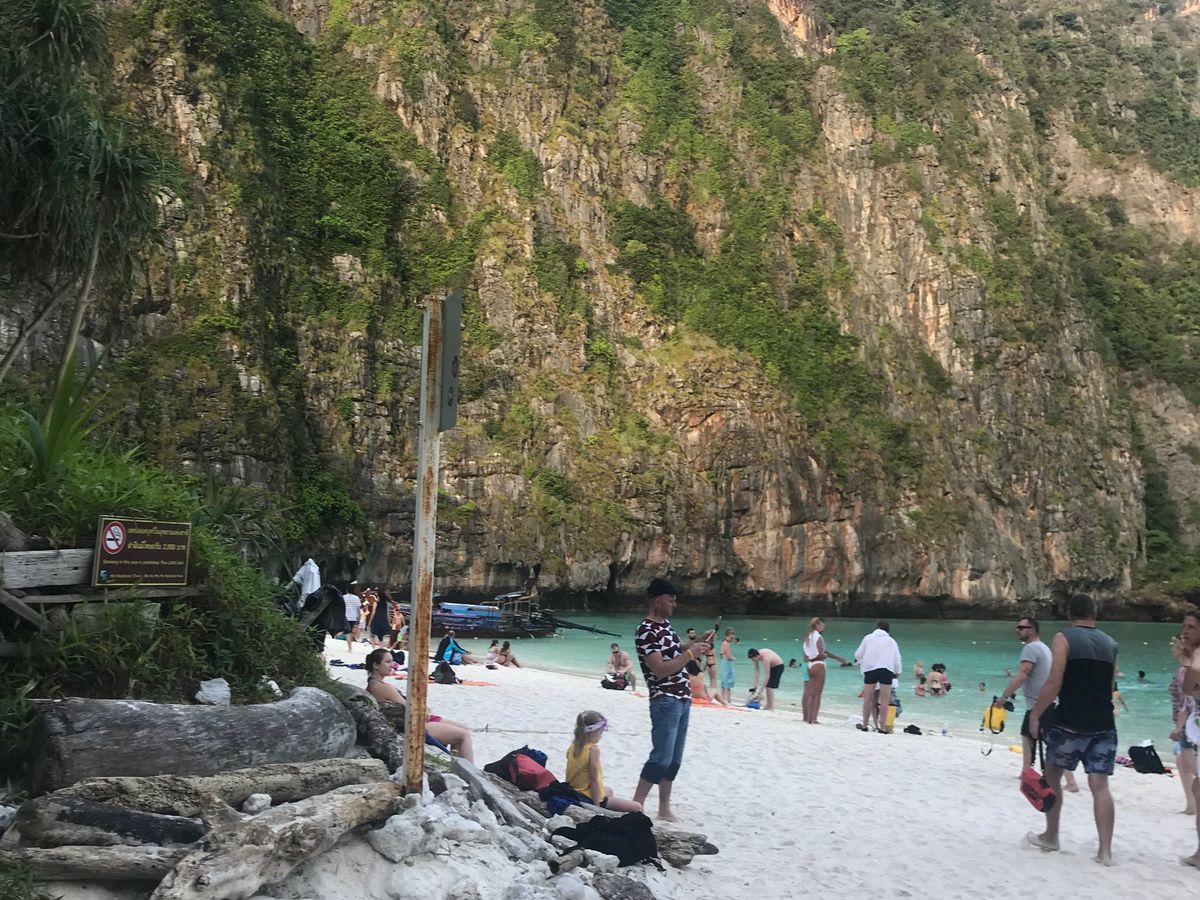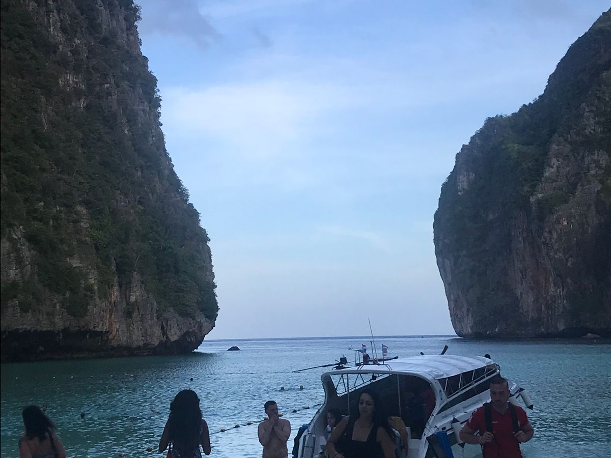 6時半に港を発ち、マヤベイまで約1時間。早朝に出発することで、静かなマヤベイを楽しめるというのが、このツアーの売りなのですが、既に、結構な数のボートが居て、ビーチは賑やか。11月初旬というシーズンの始まりで、この状況なら、これからもっと混むんでしょうね。