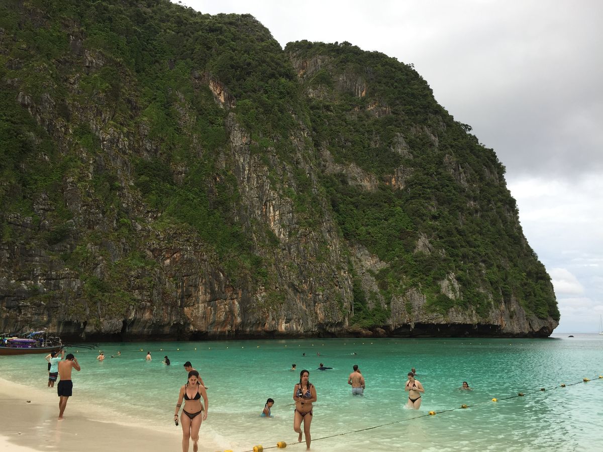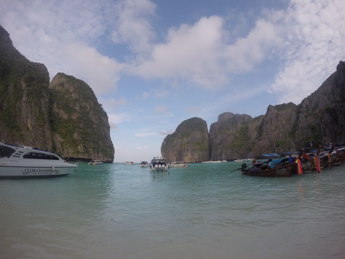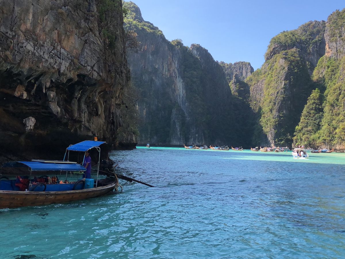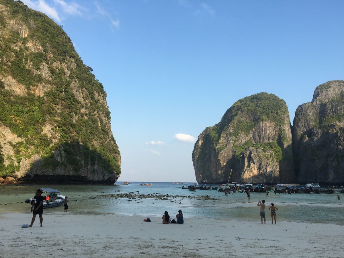6時半に港を発ち、マヤベイまで約1時間。早朝に出発することで、静かなマヤベイを楽しめるというのが、このツアーの売りなのですが、既に、結構な数のボートが居て、ビーチは賑やか。11月初旬というシーズンの始まりで、この状況なら、これからもっと混むんでしょうね。