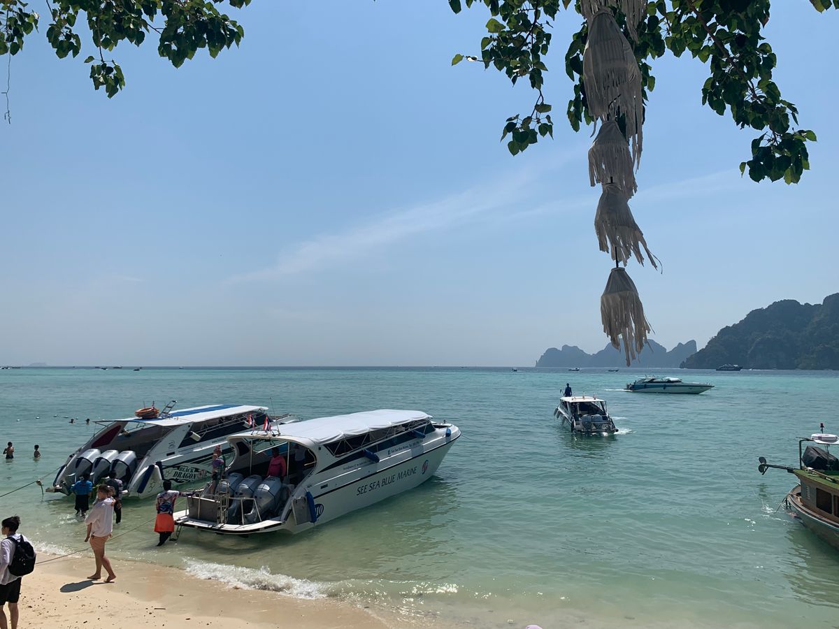 スピードボートで片道1時間で行きました。すごい振動で少し腰が痛くなりましたが、現地で過ごせる時間が多い方が良いかなと選択。シュノーケリングの時間も2回あり、十分キレイな海を堪能できました。スピードボートの中ではクーラーボックスに入った飲み物も飲み放題、お菓子や果物まで配って頂き、とても楽しい1dayドリップでした。マヤベイはすごい混んでいて桟橋を歩くだけでも時間がかかりましたが、ザビーチの映画の舞台になっただけあり、白い砂浜にエメラルドグリーンの海、感動的でした。マヤベイやピピドン島など、スピードボートから降りたり乗ったりが何回もあり、小さな子供連れだったので少し大変でした。