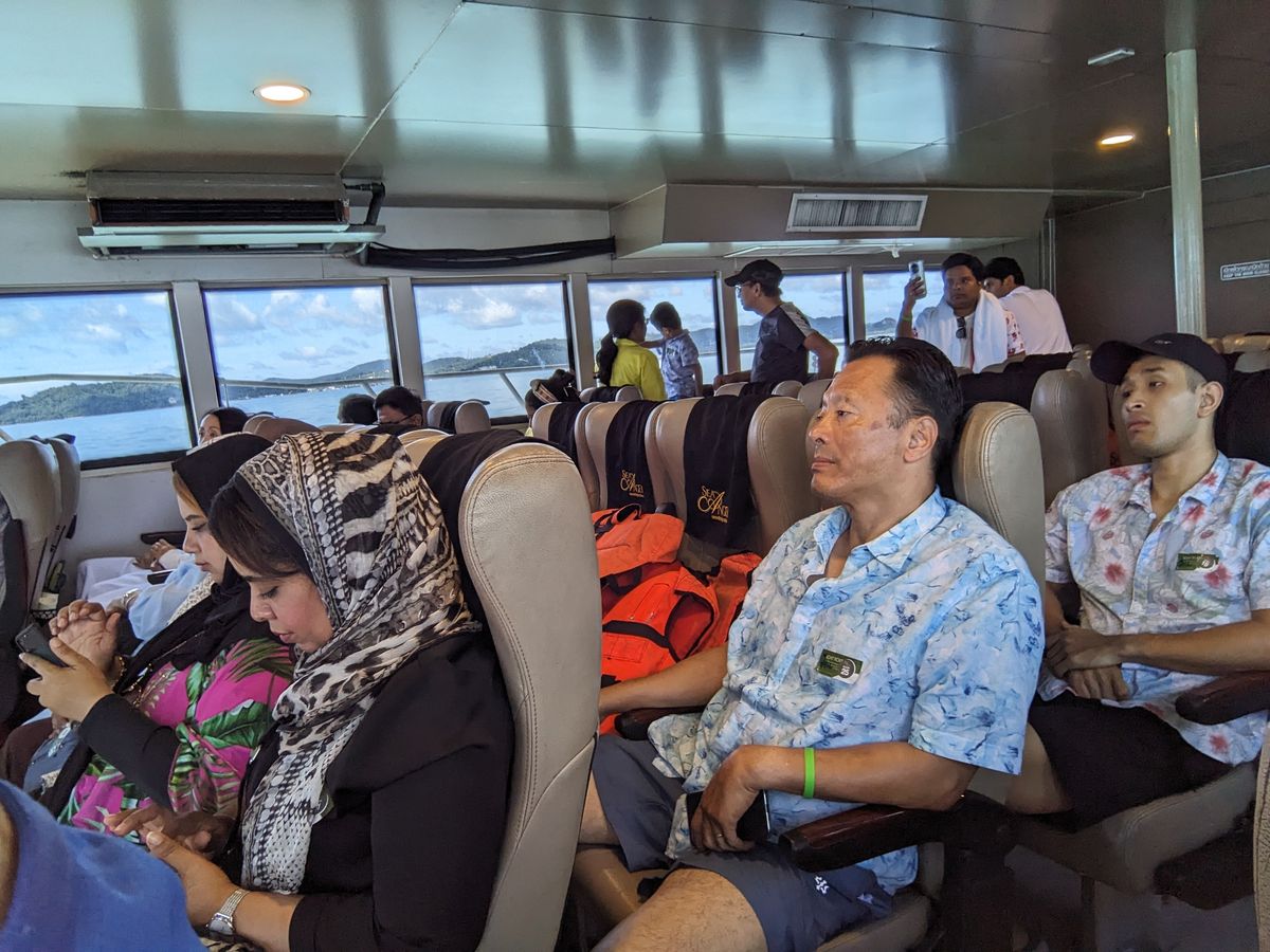 港に到着すると島の税金を徴収される。外で長い説明があり、乗船。シルバー席は2階で、右2列,中央5列,左2列の席であった。ちなみにゴールド席は3階である。飲み物とクッキーの配布があった。出発間際に、シルバー席以外の客が空いているシルバー席に座席変更する。商売のためには致し方ない。ほとんどがインド人系とおぼしき団体。その人たちが特に騒がしかった。携帯もビデオ通話、大きな声で他人さまはおかまえ無。途中でみんなデッキに行ったので多少静かになった。昔で言う社員旅行的ノリ。帰りも同じ。