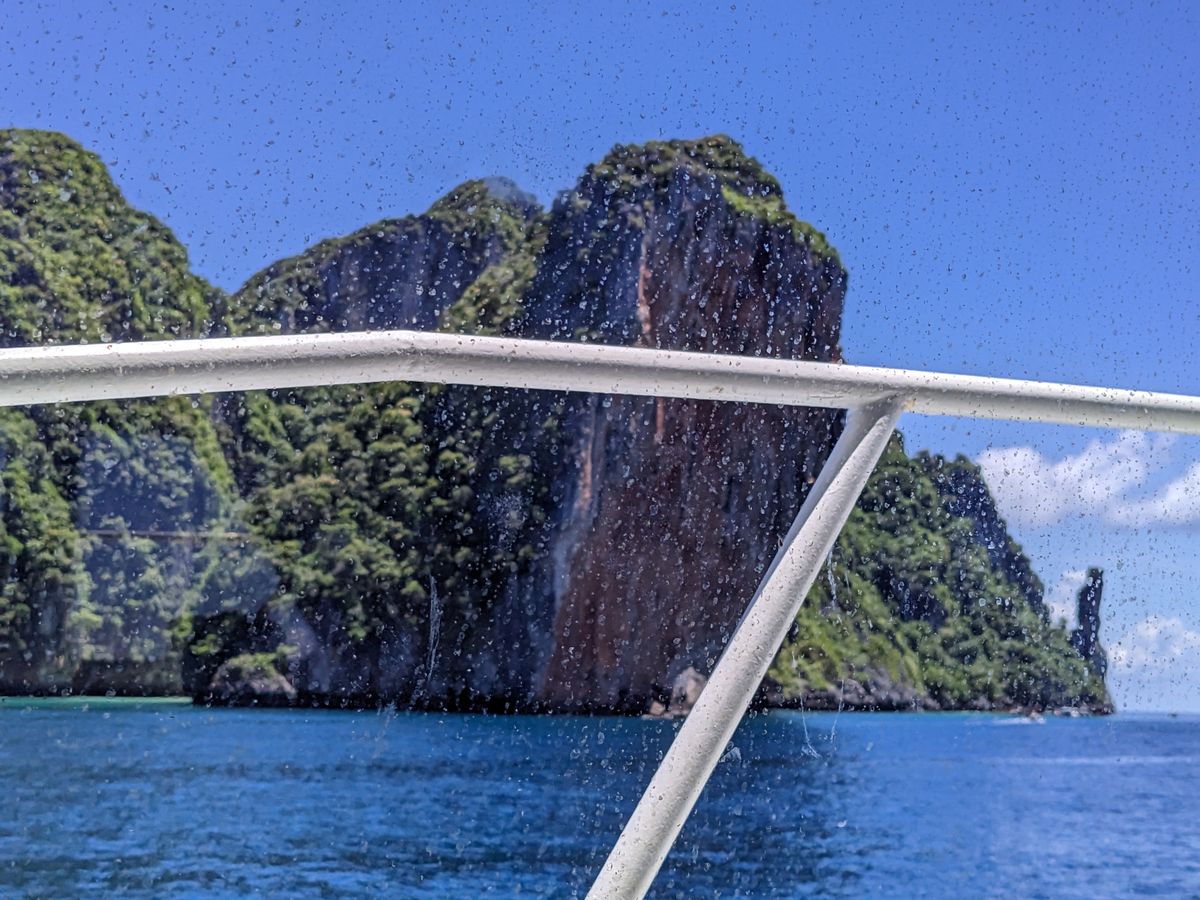 船は40人乗りで半分ほどが日本人だった。ピピ島まで1時間かかり、前後左右の大きな揺れで船酔いされている方もいた。運転手の隣の2人席はつかまるところがありよかった。