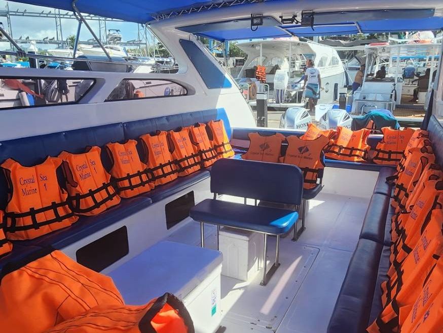 あと、サンダルで参加する方が多かったのですが、絶対にマリンシューズがオススメです。船上はサンダルを脱ぐのですが、マリンシューズは履いたまま船に乗れますし、上陸する際やシュノーケリングの際、足を怪我することも防げるし、フィンも着けやすいです。マヤビーチへの歩きも靴なので楽です。