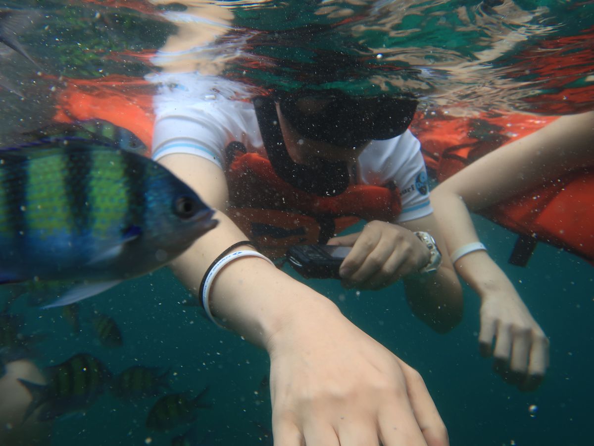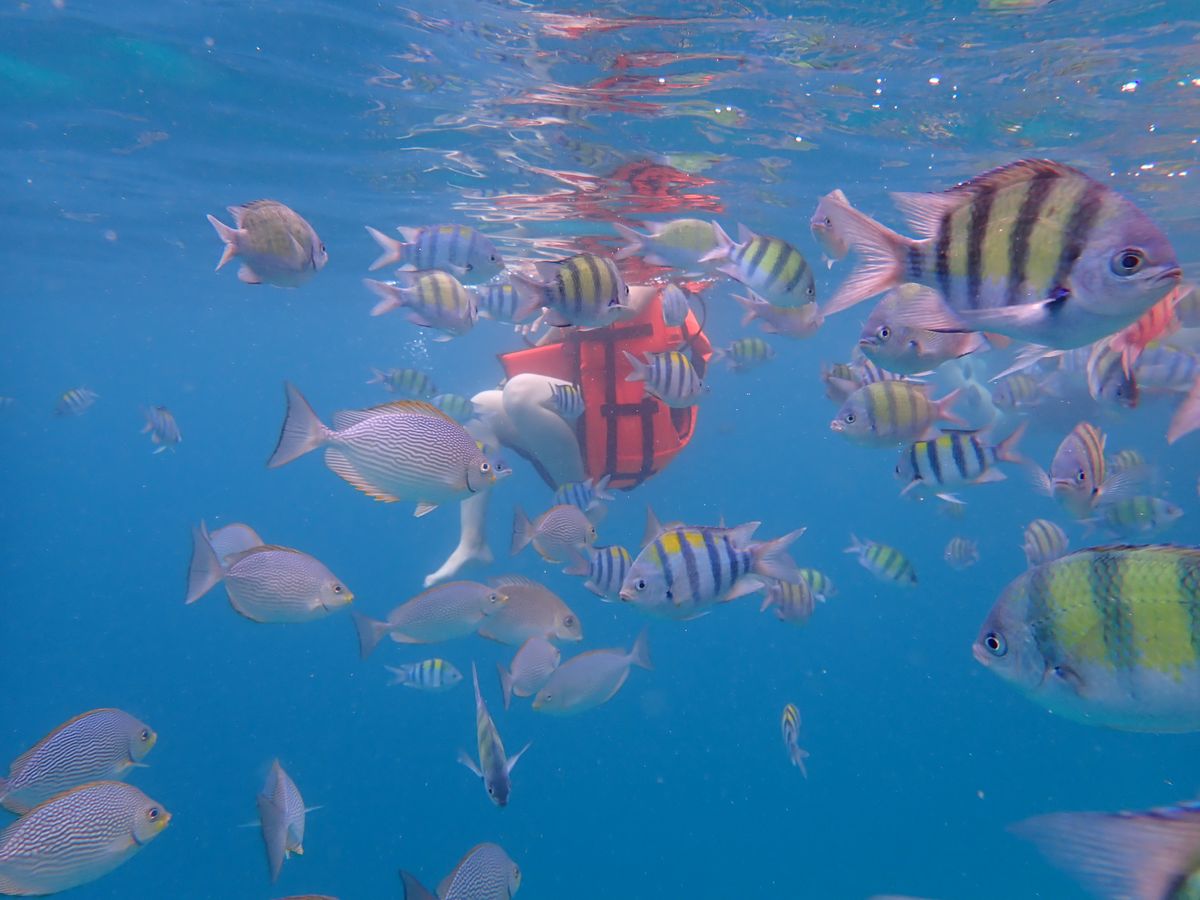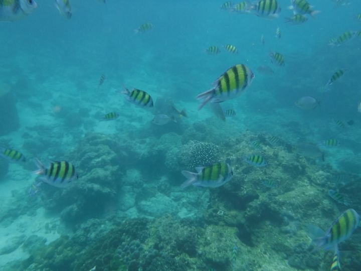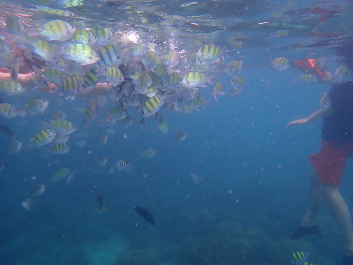シュノーケリングも思っていたよりハードでした。波打ち際をチャプチャプ・・的なものを想像していたのですが、実際は、ボートから救命胴衣を身に着けてダイブ!海底は数十メートル下とのことで当然ですが足もつかず、浮いているのは結構大変でした。しかも、シュノーケリングは2回。ま、やめることもできますが。せっかくなので2回とも参加しました。すごく疲れましたが、寄ってきてくれる魚たちもすごくきれいで、愛おしかったです。