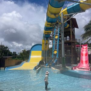 中に入る前に荷物チェックがあり、ペットボトル、浮き輪など持ち込み禁止で預けなくてはいけませんでした。受付に並ぶように言われ、入場券付だったので不安になりましたが、バウチャーを見せたらリストバンドをくれました。プールはスライダーが充実しており、流れるプールや波のプールが楽しかったです。お昼はリストバンドに現金をチャージして買い物ができ、残金は出る時に返金できました。帰国日で3時お迎えだったので遊び足りないぐらいでした。