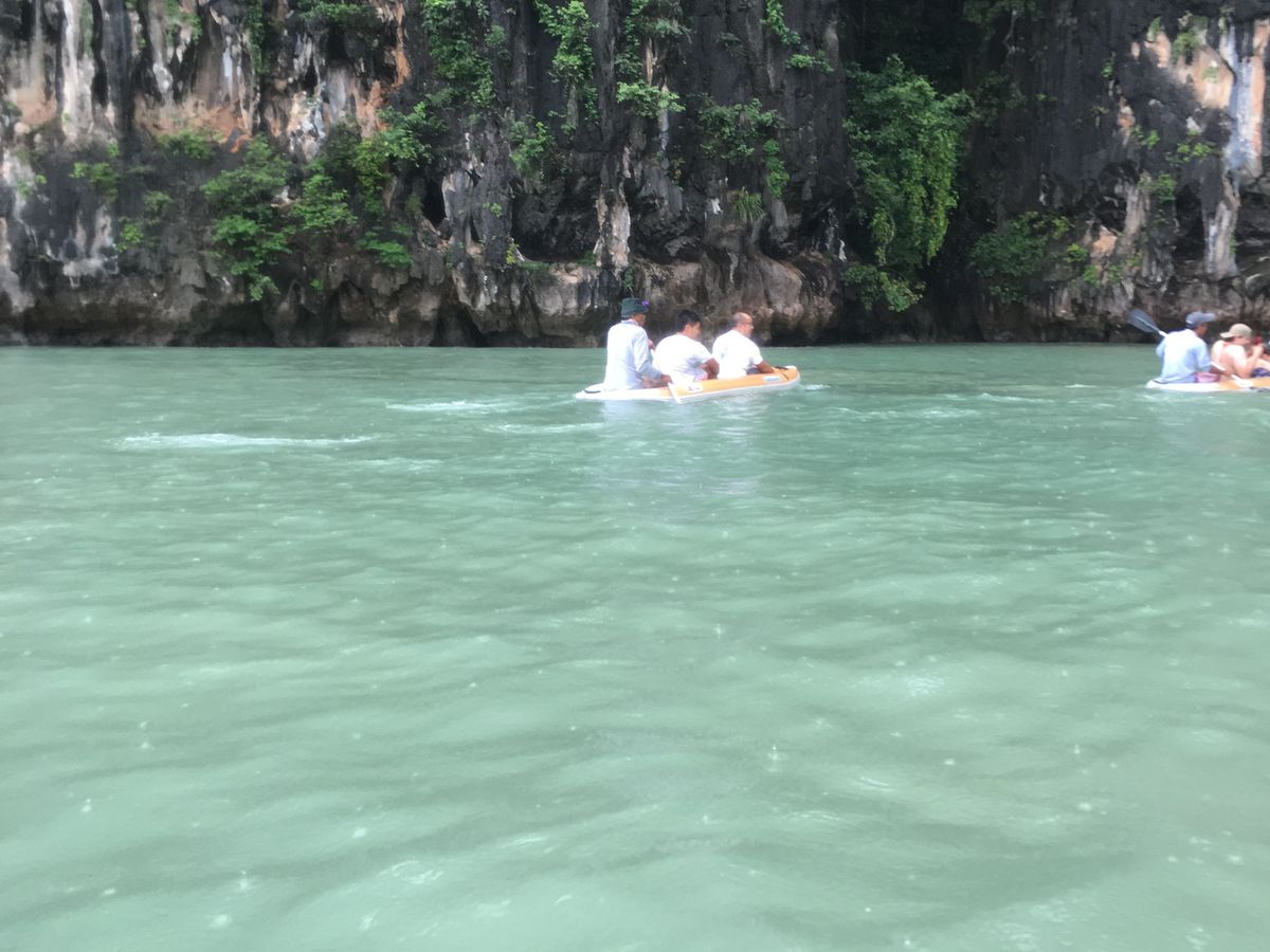 まず40分間位でパナック島に到着、歩いて行ける洞窟探検 で鍾乳洞を歩いて散策しました。それから10分位でホン島でシーカヌー(船頭+2人)体験。洞窟もありスリル満点でした。(船頭に1人50THBチップ) そこから約20分ピンカン島(別名ジェームスボンド島)にも立ち寄りました。その後水上生活者の村、そこで昼食になります。味は個人的には中より下でした。お店もたくさんあったので買い物もできますがあまり時間はないです。