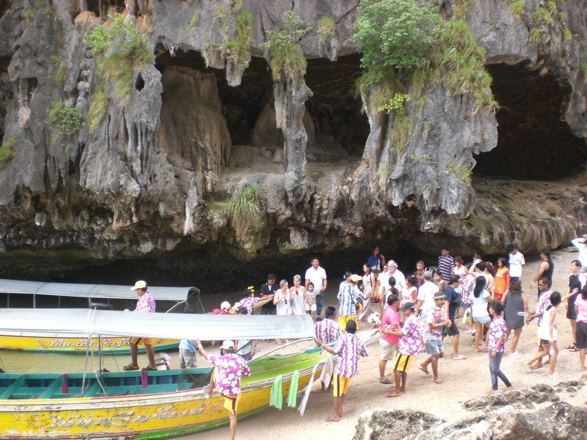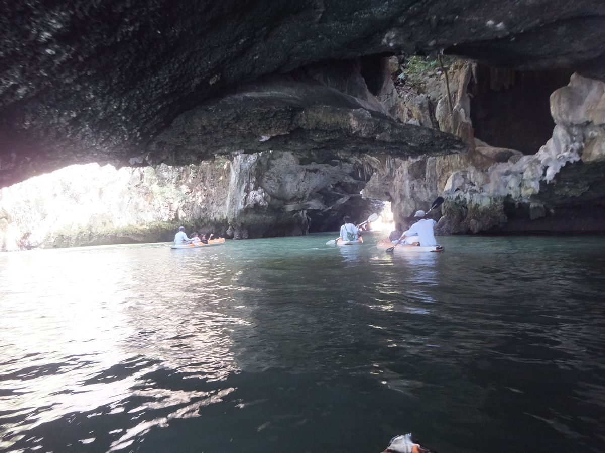 往復の時間が長かったけど、内海をゆくのも良いね。松島みたいに島がたくさんあるから、次から次への現れ、視界から遠ざかる島々を見て過ごすのも悪くなかった。島々は、大なり小なり浸食されていて、海面でくびれており、ときには洞窟や残った岩などが垂れ下がっていて、おもしろかったね。カヌーで2回、洞窟をくぐり、ときにその先にあるラグーンにで、青空を仰いで帰ってきた。引き潮だったので、海は期待していたほど、きれいではなかった。透き通っていなかった。最後に海で泳いだ。引き潮のせいもあるけど、暖かったね。いつもプールで泳いでいたので、底なしの場所で泳ぐのは、最初、ちょい勇気がいるね。メキシコの洞窟内で泳いだときは、暗いし、水は真水で冷たいし、怖かったね。プーケットでは、青空の下だし、そんなに深い海ではなかったし、怖いと思うのがどうかと思うほどだが、こればっかしは、どうしようもないね。水泳選手でもプール以外で泳ぐのは苦手の人がいると聞いて安心したんだ。