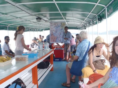 プーケットに行ったら絶対島!ということで、日本語ガイド付きの送迎付きプランを探していたところこちらを発見。即申し込みしました。船が大型船ではないのでけっこう船の揺れが心配でした。間違いなく酔い止め必要かと思い持参していったのですが、集合場所にすでに準備されており、行き分、返り分をちゃっかりキープすることができたので帰りの船は落ち自適な豪雨に見舞われ船がばっしゃんばっしゃん揺れましたがめちゃめちゃ楽しかったです。まわりの参加者もめちゃめちゃテンション上がりっぱなしで日本人は私たちだけでしたが十分楽しめました。いろいろな名所(?)を船で徐行しては写真、走っては、徐行で写真って感じで良いものが観れました。運よくイルカの群れにも遭遇しました。食事つきでしたので昼食はとあるレストランでのバイキング。まあ普通。島での滞在時間がけっこう短くて、個人的にはひとつの島で2時間とかゆっくりしたかったのですが、ぱっぱぱっぱって感じでした。いろいろまわれたからよかったのかもしれませんが。。。この価格でしたらまずまず満足です。