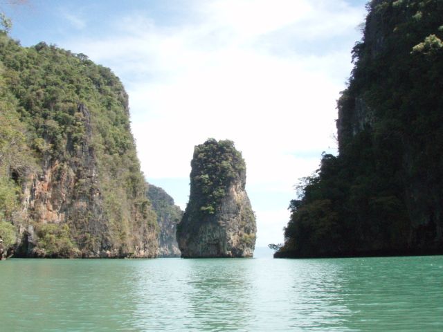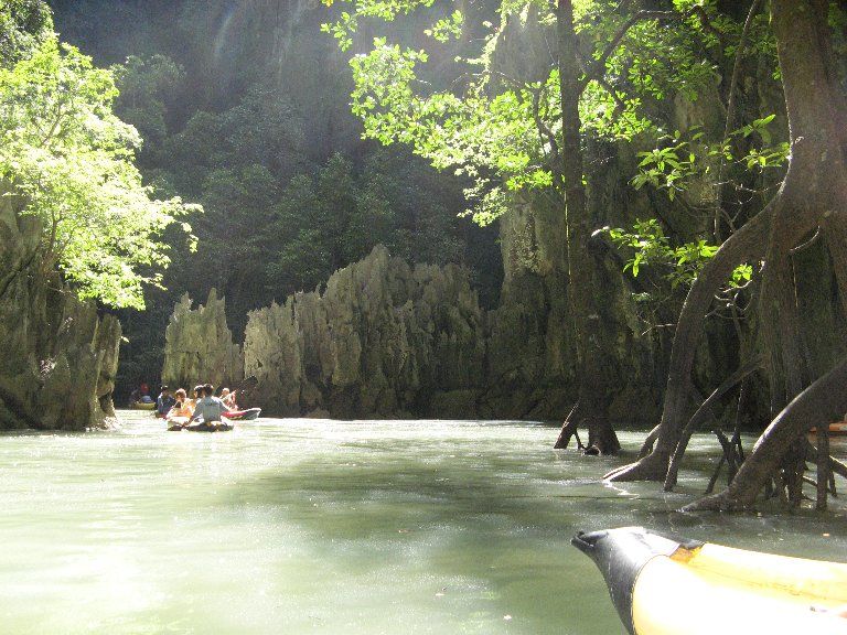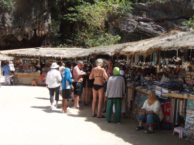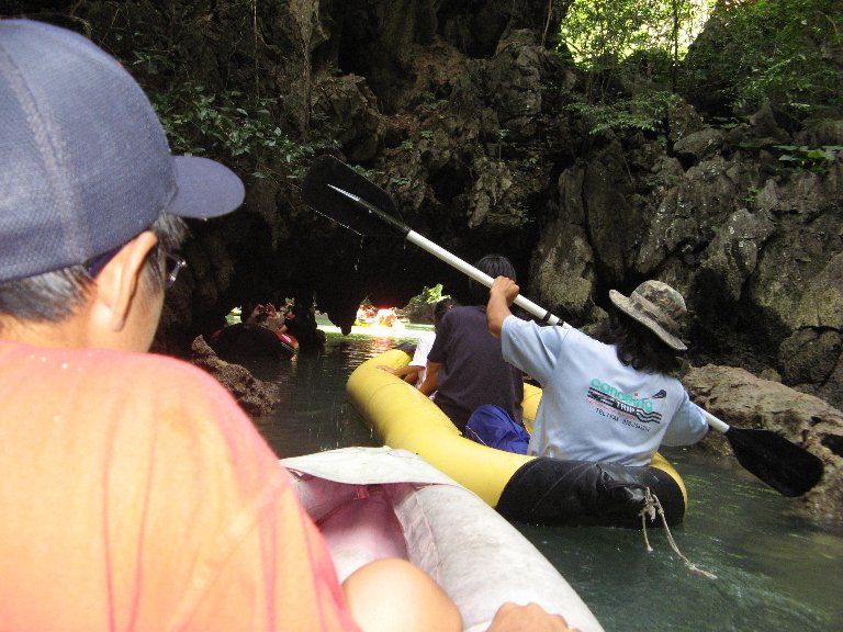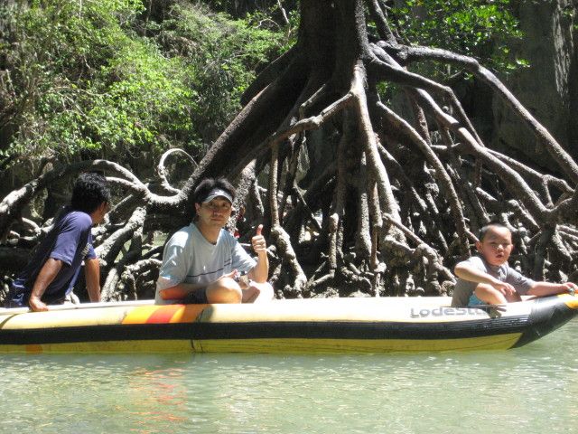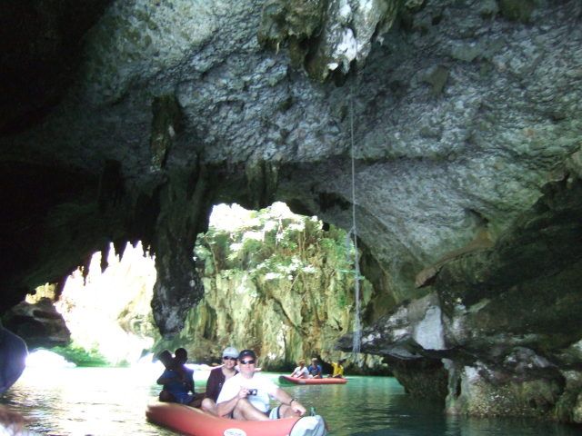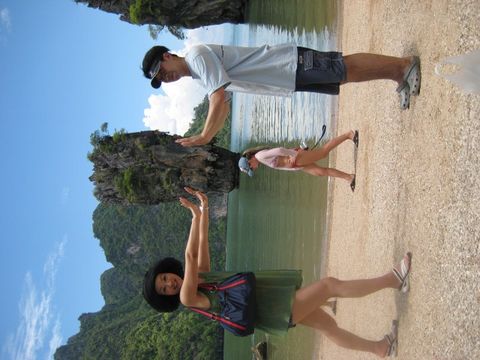台湾等、世界各国の人と一緒でした。一番目の島に上陸しようとした時又大雨!外国の若い人達は平気で海に飛び込んではしゃいでいました。ジェームスボンド島では銃を構えたポーズで記念撮影!狭い洞窟をカヌーで潜り抜けたり、上陸して洞窟内を歩いたり初めての体験で天気は今一でしたがとても楽しかったです。乾季の晴れた日にもう一度行きたいと思います。