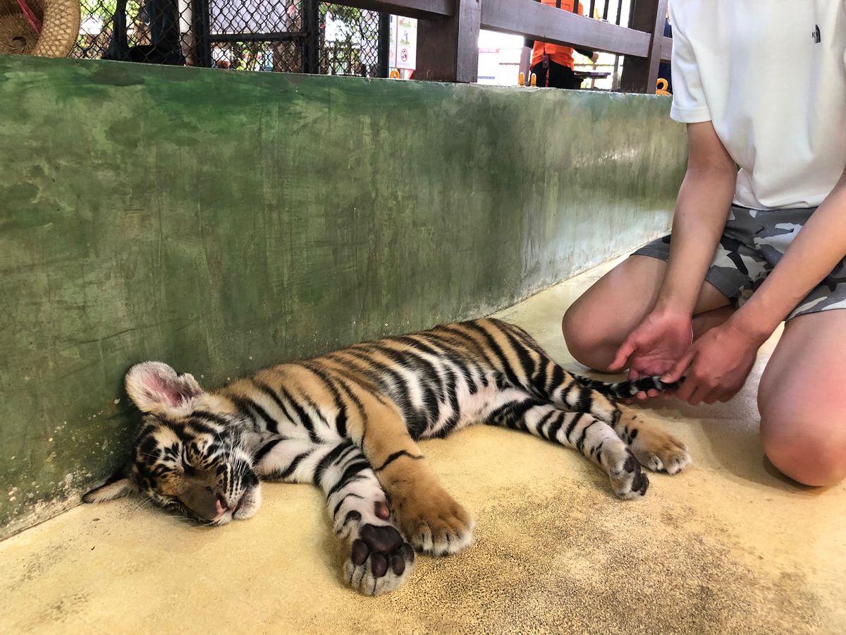 我が家は、当初は「象のトレッキング→お寺→オールドタウン散策」の予定でしたが、ガイドさんにオススメを聞いたりしているうちに、子供たちが「虎をさわりたい!」というので、急遽「象→虎→日本人が経営されている雑貨屋→ホッケンミー(焼きそば)ランチ→オールドタウンは車で通過」1時間30分延長してホテルに戻りました。