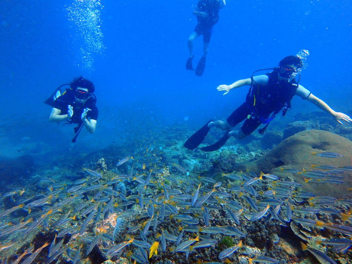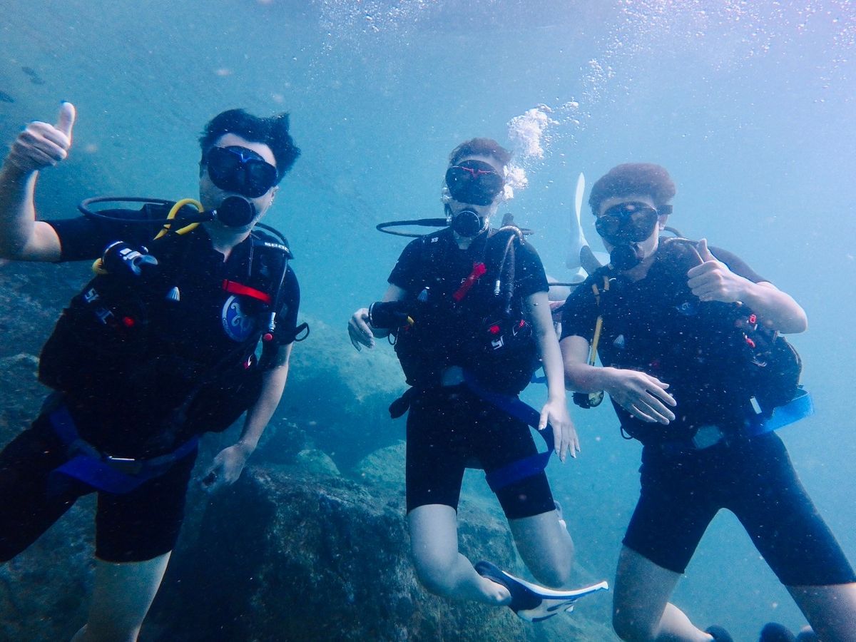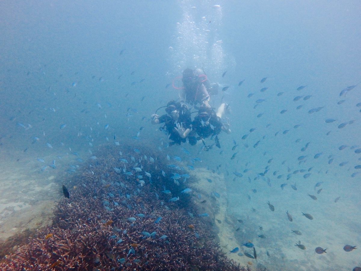ややメタボ気味の54歳夫婦(&メタボには程遠い大学生の子供2人)で、人生初ダイビングに挑戦しました。ボンベを背負い、イザ、海中へ!カラフルなサンゴ、壁の様に群をなす魚達が手の届く距離で見られるなんて…百聞は一見にしかずとはよく言ったもの。年齢に怯まずトライして本当に良かったです。インストラクターのナカさん、アヤコさんも気さくで朗らか。海中でのリードも頼もしく、安心して潜ることが出来ました。有り難うございました。