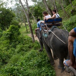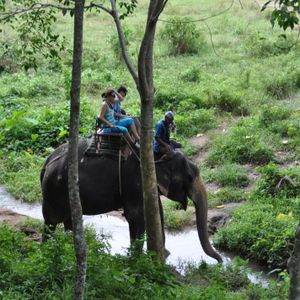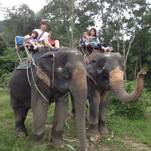 子供のゾウ2匹の間で写真を撮らせてくれたり、ゾウがハーモニカをふいてくれたりしました。その後2人一緒にゾウに1時間くらい乗せてもらいました。ゾウ乗りのおじさんも優しく対応してくれて、途中写真を撮ったり、音楽を流したり、ゴムの木を教えてくれたり、ぞ~さん♪ぞ~さん♪と日本の歌まで歌ってくれました。とても良い経験ができて、大満足です。