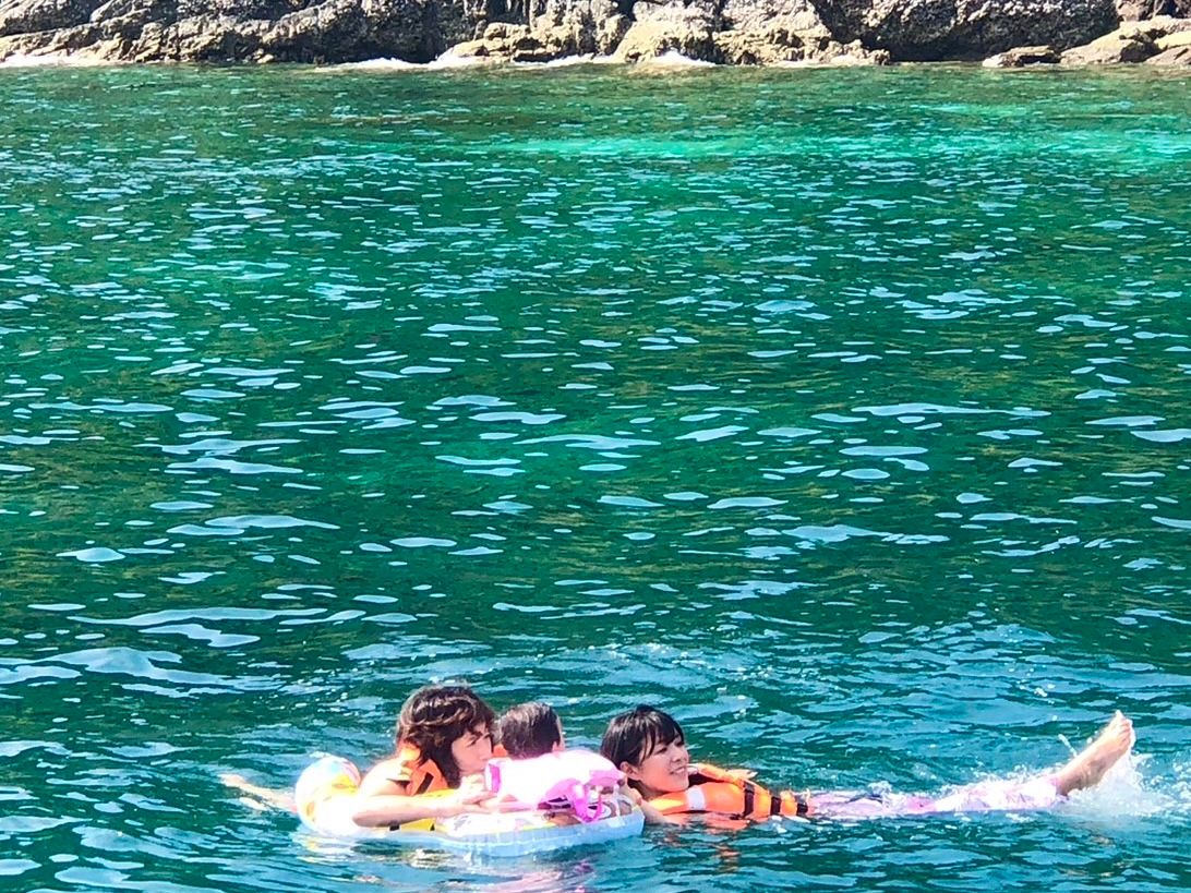 綺麗なカタマランヨットは揺れも少なく、途中のシュノーケリングタイムでは、孫も人生初の海に出て泳いでみました^^